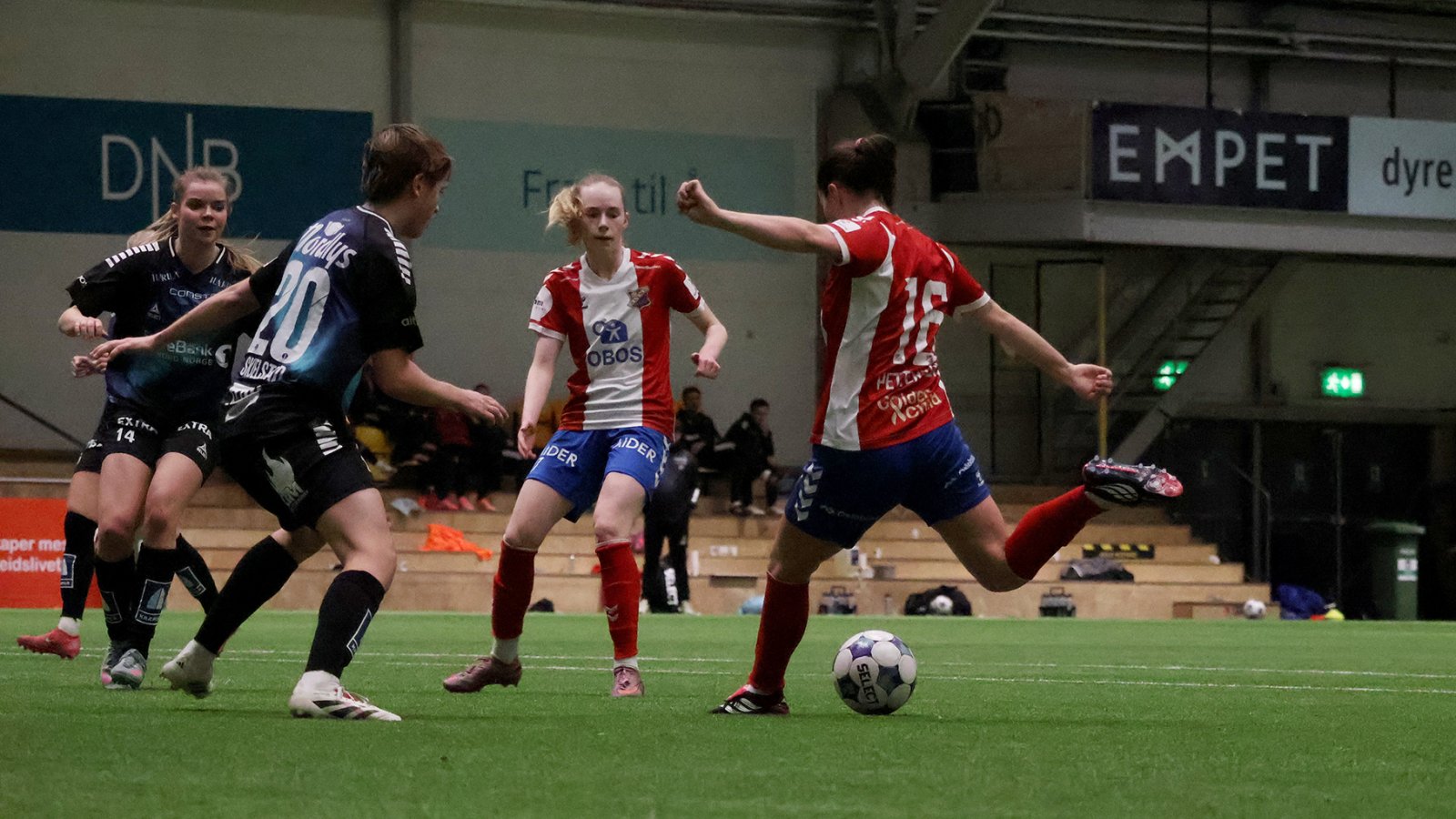 Andreomgang fortsetter med Lyn-dominans og det tar ikke lang tid før 19 år gamle Kajsa Pettersen løfter taket i LSK-hallen. Spissen fyrte av fra 25 meter og banket ballen i motsatt kryss. Vakker scoring! Hennes tredje mål på to kamper.